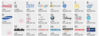 Peningkatan yang cukup besar juga diperoleh Samsung. Produsen smartphone Android terbesar di dunia ini mengalami kenaikan nilai merek sebesar 40 persen dan duduk di peringkat ke sembilan di bawah Intel. Hal sebaliknya terjadi pada Nokia. Perusahaan yang berbasis di Finlandia ini mengalami penurunan sebesar 16 persen dan duduk di peringkat 19.